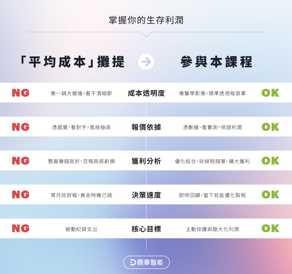 我們深知 PCB 業的每一分毛利都是在紅海中拼殺出來的。所以這堂課的初衷,是為您守住那道最後的防線。我們不希望看到技術一流的台灣廠商,因為算不清楚成本而在價格戰中倒下。我們全心為你解決痛點,是希望透過精準的數據,讓你的每一分投入、每一點汗水,都能轉化為報表上實實在在的盈餘。